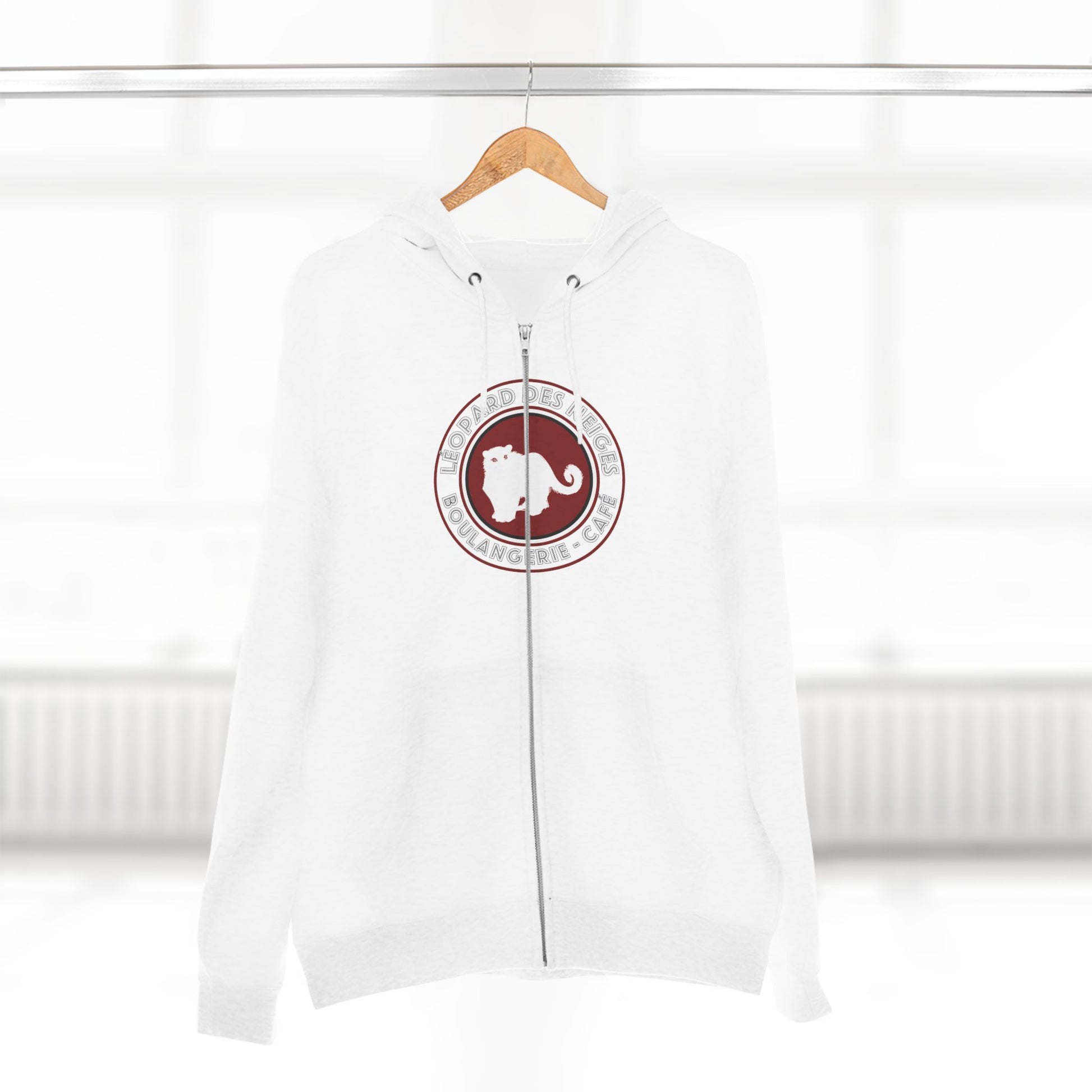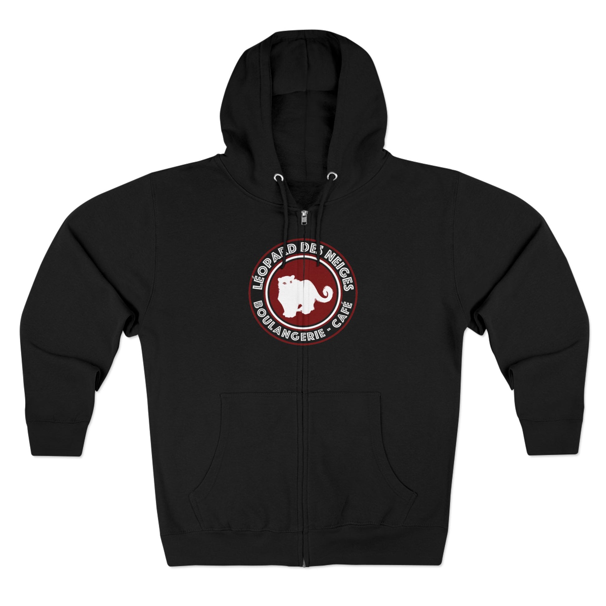 Original, organic, and looking like it's from an experience in Chambéry or in the French Alps, this classic hoodie features a logo for Snow Leopard Cafe and Boulangerie with a number of colors. The design prints across the zipper for a seamless look when closed, and fun 'split' look when open. Comfortable, elegant, classic, this is likely to be a quick go to in your wardrobe, fall activities, and setting yourself apart.